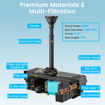 A: This system features a multi-stage integrated filtration system including filter sponge, bio-balls, filter stones, and a built-in UV clarifier. It helps remove debris, control algae, and improve water clarity, providing a safe and healthy environment for aquatic life.