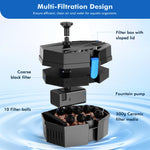 A: It uses multiple filtration layers including sponges, bio-balls, and ceramic filter media to remove debris, balance water quality, and protect fish and the pump from damage due to clogging.