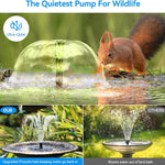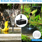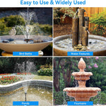 A: This solar fountain comes with 10 nozzles and a 4.9ft tubing for various water styles. You can customize double-layer spray modes to create unique water features for your pond or bird bath.