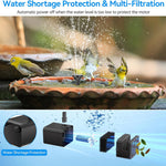 A: The pump includes a water shortage sensing device that shuts off the motor to prevent burnout if the water runs out. It also has a two-way pre-filter system to prevent debris like leaves or dust from clogging the pump. Two extra filter sponges are provided for easy maintenance.