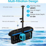 A: The pump has dry-run protection and a multi-stage filter design with two filter mats and 20 bio-balls to prevent clogging and extend pump life.